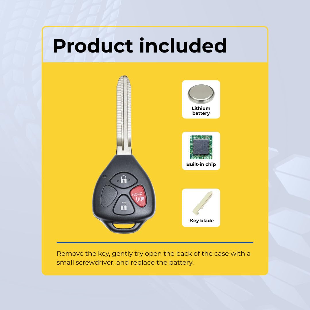 - Match the FCC ID — This is the most reliable way to guarantee compatibility. Open your current key fob and look for the FCC ID printed on the back of the case or on the circuit board inside. This listing’s FCC ID is Hyq12Bby. Make sure it matches your existing key’s FCC ID exactly. The FCC ID identifies the exact radio transmitter — if the FCC IDs match, the keys are functionally identical.