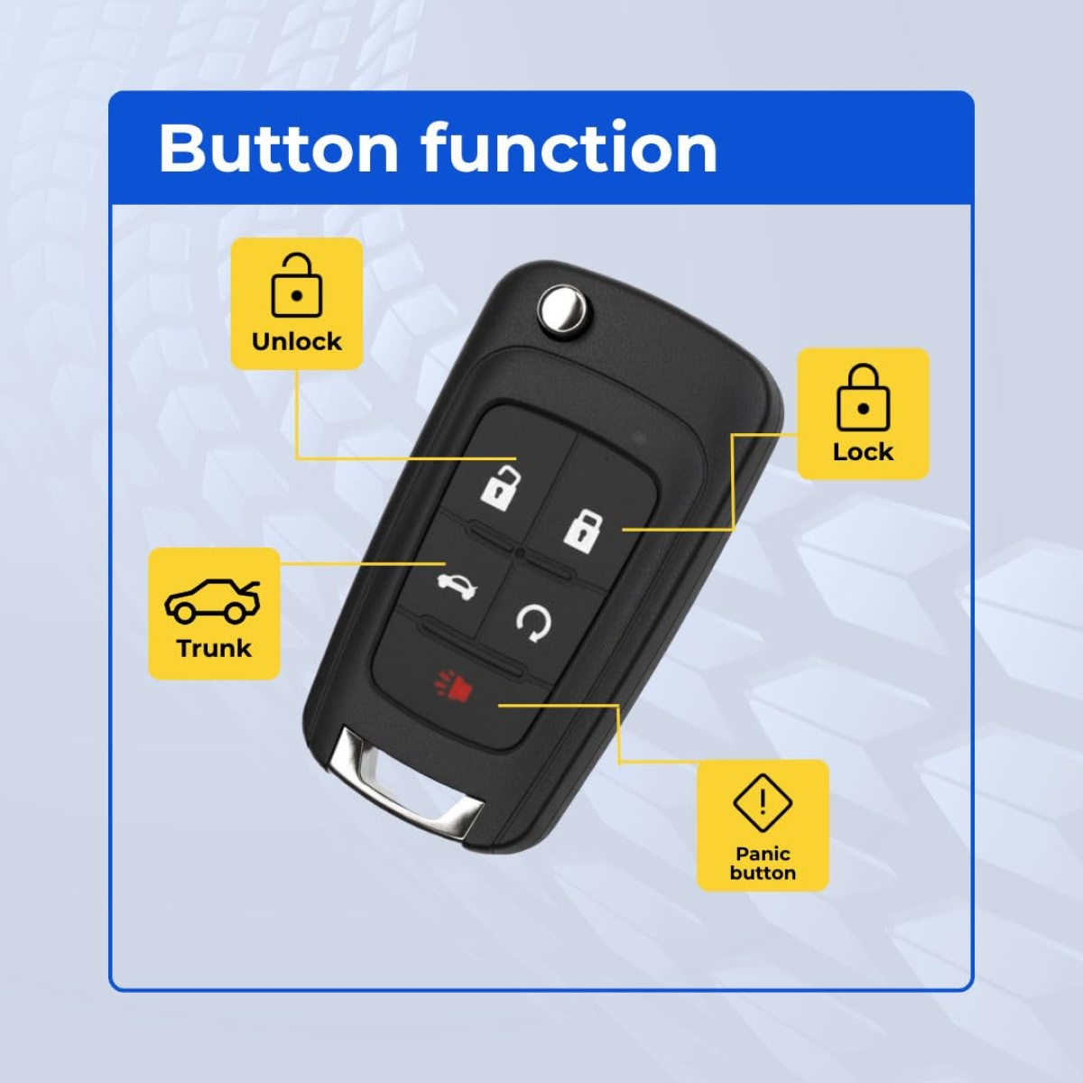 - Count the Buttons — Make sure the replacement has the same number of buttons in the same layout as your current key. This is a 5-button key fob remote. Common configurations: 3-button (Lock, Unlock, Trunk/Panic), 4-button (Lock, Unlock, Trunk, Panic), 5-button (adds Remote Start). A key with different buttons may still work for basic functions but won’t have all features.