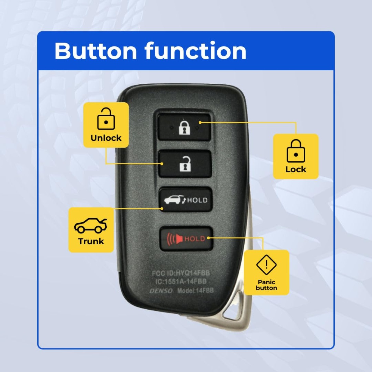 - Match the FCC ID — This is the most reliable way to guarantee compatibility. Open your current key fob and look for the FCC ID printed on the back of the case or on the circuit board inside. This listing’s FCC ID is Hyq14Fbb. Make sure it matches your existing key’s FCC ID exactly. The FCC ID identifies the exact radio transmitter — if the FCC IDs match, the keys are functionally identical.