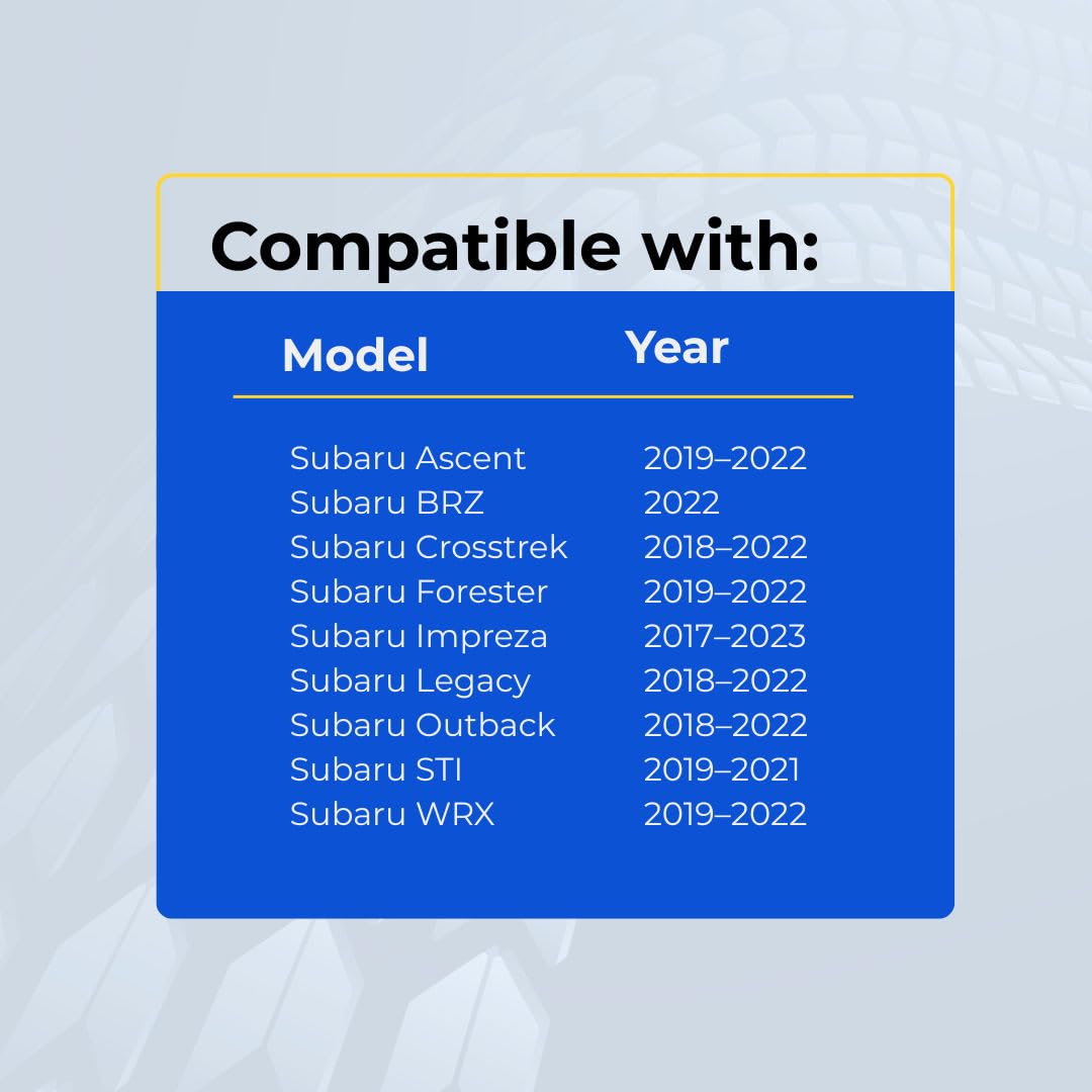 - Not manufactured by, endorsed by, or affiliated with SUBARU or any vehicle manufacturer.
