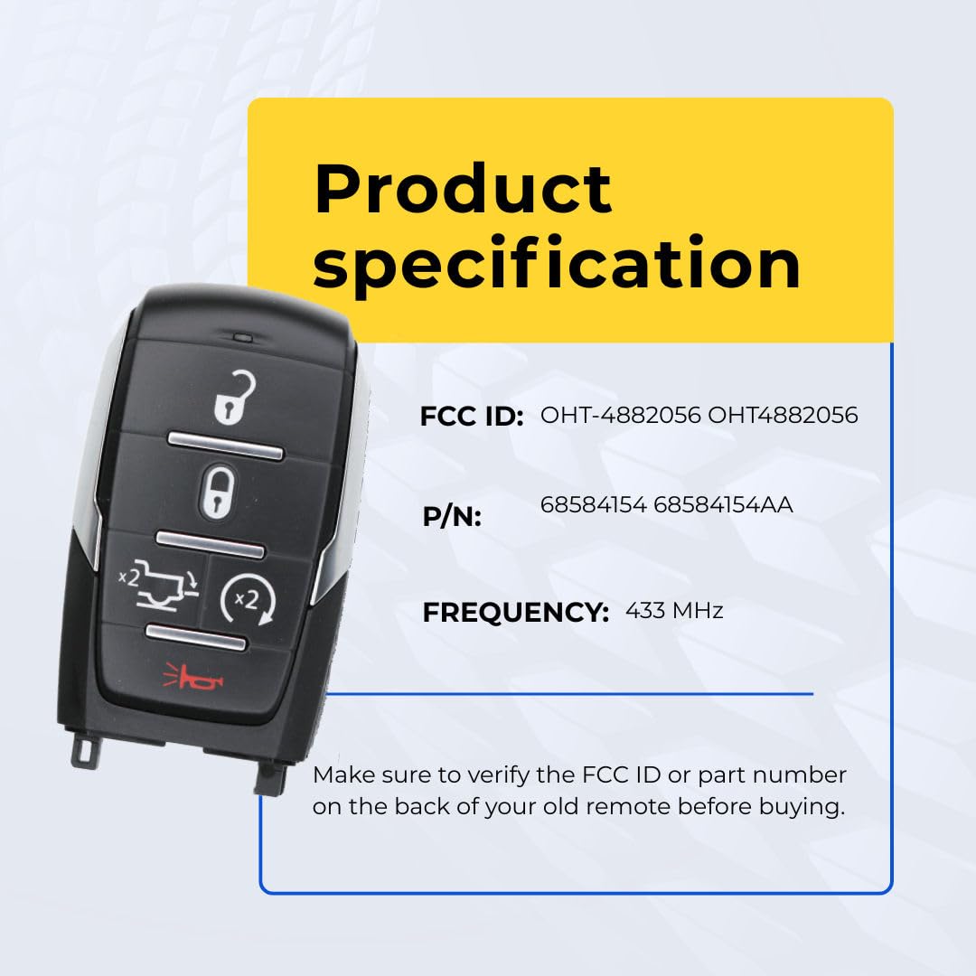UrbanX Replacement 2019 RAM 1500 Key Fob – Fcc: Oht-4882056, Oht4882056 – Pn: 68584154, 68584154Aa – 5 Button