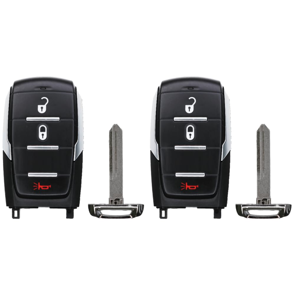 This is a replacement smart key remote for the 2021 RAM 1500. It comes complete with all necessary electronics and a new battery, ready for programming to your vehicle. This two-pack provides a convenient way to replace a lost or broken key and have a spare on hand.